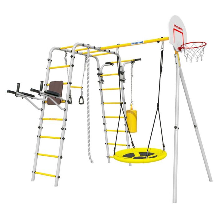 Желтый и серый детский спортивный комплекс для дачи ROMANA Fitness — идеальный выбор для активного отдыха вашего ребенка.