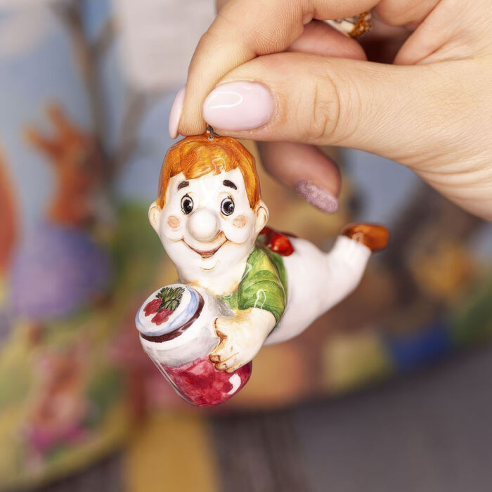 Это изделие ручной работы представляет фигурку в меру упитанного мужчины в самом расцвете сил с пропеллером на спине и с банкой любимого малинового варенья в руках — Карлсона. Этот литературный персонаж, созданный шведской писательнице Астрид Лингрен, который живёт на крыше и летает сам по себе, воплощенный в керамике, станет чудесным украшением для новогодней елочки, будет трогательным подарком, замечательно подойдёт для оформления интерьеров, порадует коллекционеров.