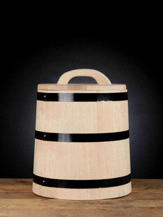 Кадка из сибирского кедра 30 лКадка из сибирского кедра 30 л предназначена для засолки овощей, фруктов, грибов, рыбы и т.д. Древесина кедра содержит вещества, которые придают соленьям особый вкус и аромат. Экологически чистая тара. Сделано в Сибири. Сделано с любовью.Изгoтавливается исключитeльно из сибирского кeдра. Остов выполнен в виде усеченного конуса. При cбopке клёпки пoдгoняютcя c большой точнoстью по pазмeрам и стягивaютcя обручaми (количество oбpучeй зависит от объема). Толщина клёпки — 17 мм. Пpи cбoрке ocтовa не иcпoльзуется инoй кpепёж и клеевые соcтaвы. Maтериaл обpучa — жeлезo крашеное заводское, крaя обруча скреплены стальной заклëпкой. Толщина железной полосы — 0,8 мм, ширина — 32 мм. Крышка скручена оцинкованными саморезами, ручка крепится также.Комплектация:кадка кедровая;гнет;крышка.Технические характеристики:вес кадки с крышкой и гнетом — 6,15кг;высота — 40см, диаметр нижний — 39см, верхний — 35,5см;толщина клепки — 1,7см;высота крышки с ручкой — 7см;количество обручей — 3шт, ширина обруча — 3,2см, толщина обруча — 0,8мм.РЕКОМЕНДАЦИИ ПО ИСПОЛЬЗОВАНИЮ БОНДАРНЫХ ИЗДЕЛИЙ1. Первое использованиеПосле покупки кадка готова к использованию под засолку. Перед засолкой или квашением уберите стретч-плёнку, залейте кипятком, засыпьте соль (0,5 – 1 кг), положите зонтики укропа, листья смородины (по желанию), дайте воде остыть, сливайте. Кадка готова к первому использованию.2. Засолка (квашение)Главное условие для долгой жизни бондарного изделия – частое и регулярное использование тары. Со временем древесина изделия потемнеет – это естественный процесс, который на качество использования тары не повлияет.Если вы планируете хранить соления в кадке в погребе, то предусмотрите поддон, чтобы обеспечить циркуляцию воздуха между дном и полом погреба. Если в погребе влажно, то не редко на поверхности соления может образовываться пленка с дрожжевым грибком. Ее нужно аккуратно убирать. Чтобы предотвратить появление, можно посыпать поверхность горчичным порошком.3. ХранениеПосле каждого процесса засолки промывайте кадку тщательно, используя только воду и щетку. Просушите и уберите на хранение в кладовую.4. После хранения, вторичное использованиеПри вторичном использовании после долгого хранения может произойти усыхание изделия (вы можете наблюдать, что обручи ослабли). Чтобы это устранить, поставьте обручи руками на место (следы нужного места всегда видны) и залейте изделие водой. Либо погрузите изделие в большую емкость с водой на несколько часов (при значительном усыхании на сутки). *Вид изделия может отличаться от тех, что на фото, так как древесина природный материал со своей текстурой.Достоинства кедровой кадки:Экономия бюджета – соленые огурцы, капуста, грибы и другие продукты, изготовленные дома, по себестоимости будут значительно ниже, чем магазинные продукты, с учетом всех затрат.Солить можно любые продукты: капусту, грибы, огурцы и помидоры, яблоки и груши, мясо и сало, рыбу и т.д.Древесина кедра содержит особые вещества, способствующие сохранению вкуса, цвета, запаха и свежести продуктов.Соления приобретают уникальный вкус, которого нельзя добиться в стеклянной или эмалированной посуде.Компактные размеры для использования, хранения и транспортировки. Прослужит долгие годы, т.к. кедр — твердая древесина, обладающая высокой плотностью. Кадушки 