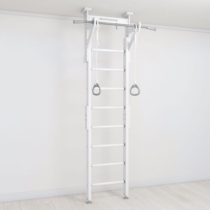 Спортивный комплекс ROMANA Eco1.1 устанавливается как враспор, так и к стене — пользователь сам выбирает удобный вариант монтажа. Таким образом, стенку можно установить практически в любом месте дома. В комплексе Eco1.1 предусмотрен фиксированный турник, а также кольца, которые можно разместить на нем.