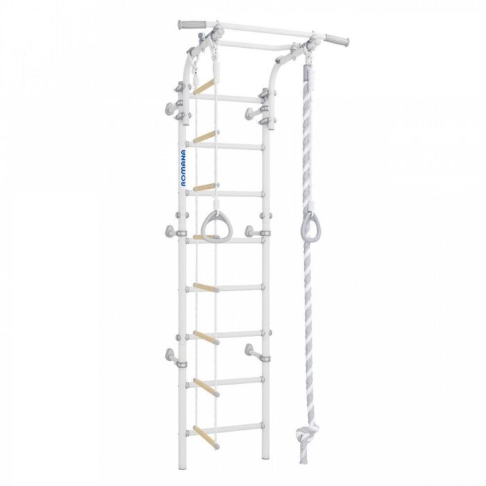 Детский спортивный комплекс ROMANA Next Muar+ представляет собой элегантное обновление самой востребованной модели в ассортименте шведских стенок, покрытый бархатистым покрытием Муар. Комплекс имеет белые матовые стойки, гладкие металические перекладины и серую фурнитуру, которая сочетается с навесным оборудованием хорошо впишется в современный интерьер.