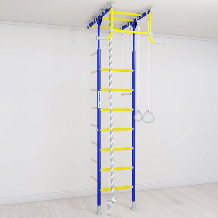 Конструкция ROMANA R1 надежно устанавливается враспор к потолку, выдерживает вес в 100 кг (испытывается при нагрузке в 200 кг). В самом комплексе широкий выбор навесного оборудования: веревочная лестница, трапеция, кольца, канат. Ступени с массажным эффектом развивает моторику рук и служат профилактикой плоскостопия.