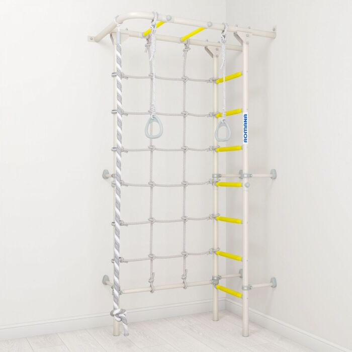 У детского спортивного комплекса ROMANA S4 оригинальная конструкция и расположение элементов. На рукоходе можно разместить разнообразное навесное оборудование. В комплекте предусмотрены канат, кольца и канатный лаз шириной 70 см из крепкого шнура. Конструкция выдерживает вес до 100 кг (нагрузка при испытаниях — 200 кг). Ступени лестницы обладают массажным эффектом, развивая мелкую моторику.