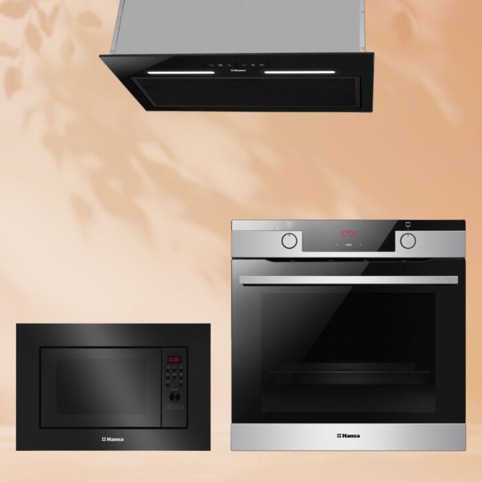 Комплект включает в себя все, что нужно для современной кухни: Микроволновую печь Hansa AMGB20E2GB, Вытяжку Hansa OMP6553BGH-G и Духовой шкаф Hansa BakingPro BOEI684097.