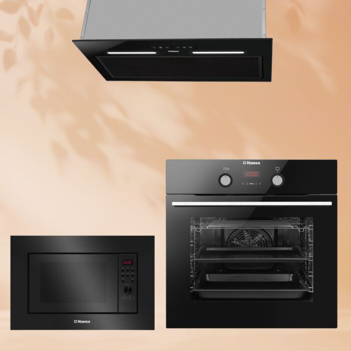 Комплект встраиваемой техники включает в себя все, что нужно для современной кухни: Микроволновую печь Hansa AMGB20E2GB, Вытяжку Hansa OMP6553BGH-G и Духовой шкаф Hansa BOES68465.