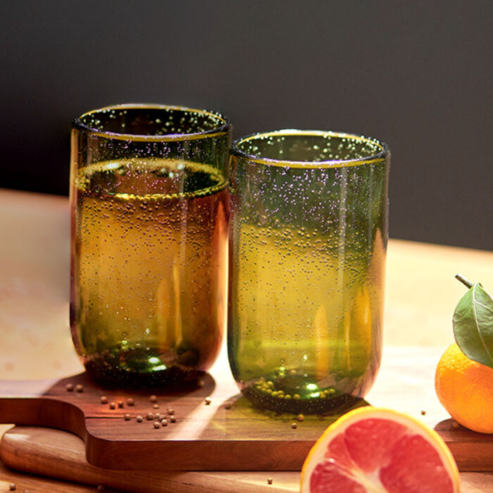 Набор стаканов из коллекции Flowi от бренда Liberty Jones привлекает внимание необычным дизайном. Изделия выполнены вручную из переработанного стекла, поэтому их размеры, а также рисунок пузырьков будут отличаться от фото: сами пузырьки могут быть разного размера и формы, а также могут образовывать неравномерные скопления. Это создает эффект настоящего потока воды, застывшего в стенке бокала.