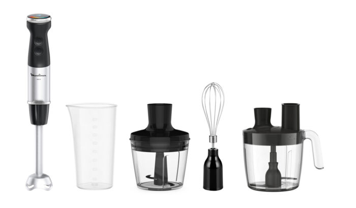 Погружной блендер Moulinex QuickChef+ DD67G810 — это мощный, практичный блендер, дополненный широким набором аксессуаров, которые расширяют его возможности. Благодаря мотору на 1000 Вт он легко справляется даже с твердыми ингредиентами, а технология Powelix гарантирует быстрое и однородное измельчение.