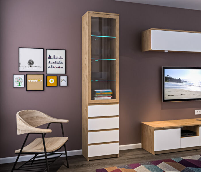 Витрина Веста СБ-2248 вполне может использоваться в интерьере соло, а также может быть дополнена элементами модульного гарнитура Веста. Минималистичный дизайн пенала-витрины позволит разместить его в помещении любого назначения – спальне, гостиной, кабинете или прихожей.При компактных размерах – ширина 50 см, высота 222 см и глубина 35 см, это довольно вместительная витрина, которая позволит решить вопросы, связанные с хранением памятных вещей. Визуально витрина разделена на два отделения – верхнее – выставочное, находится за прозрачной дверцей и имеет четыре полки. Нижнее включает четыре вместительных выдвижных ящика.Произведена витрина из современного и прочного материала КДСП. Фасадная дверца имеет остекление.