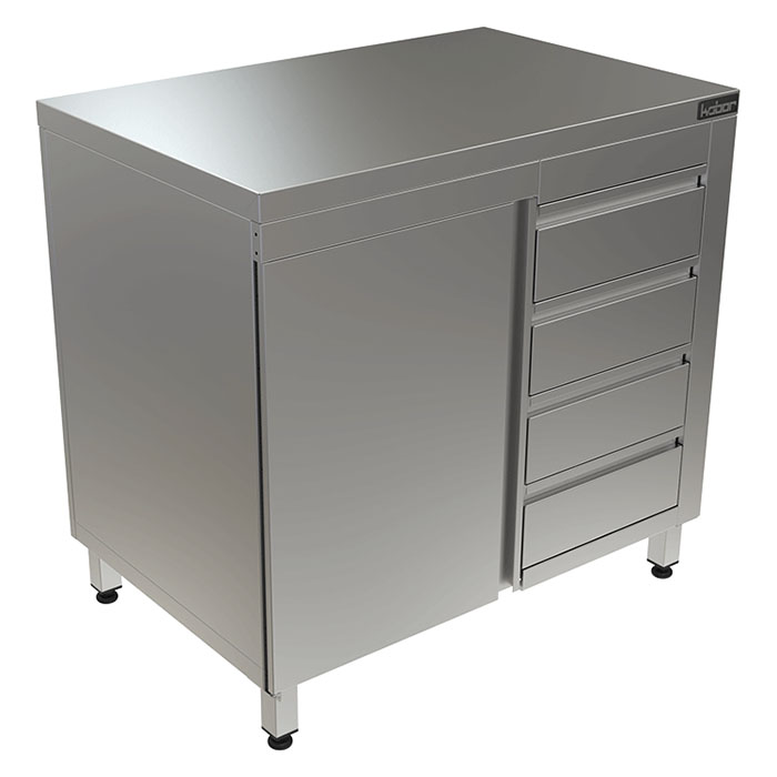 Стол-тумба кухонный Кобор СТ/1-90/70/Р произведен из высококачественной нержавеющей стали, что позволяет использовать предмет в различных цехах. Модель оснащена полкой, отделением с распашной дверью и 4 ящиками. Во избежание прогибов столешница усилена листом ЛДСП. Ножки изделия регулируются по высоте, для исключения проблем с неровным напольным покрытием, предотвращая наклон рабочей поверхности. Разборный каркас и столешница выполнены из нержавеющей стали AISI 430.