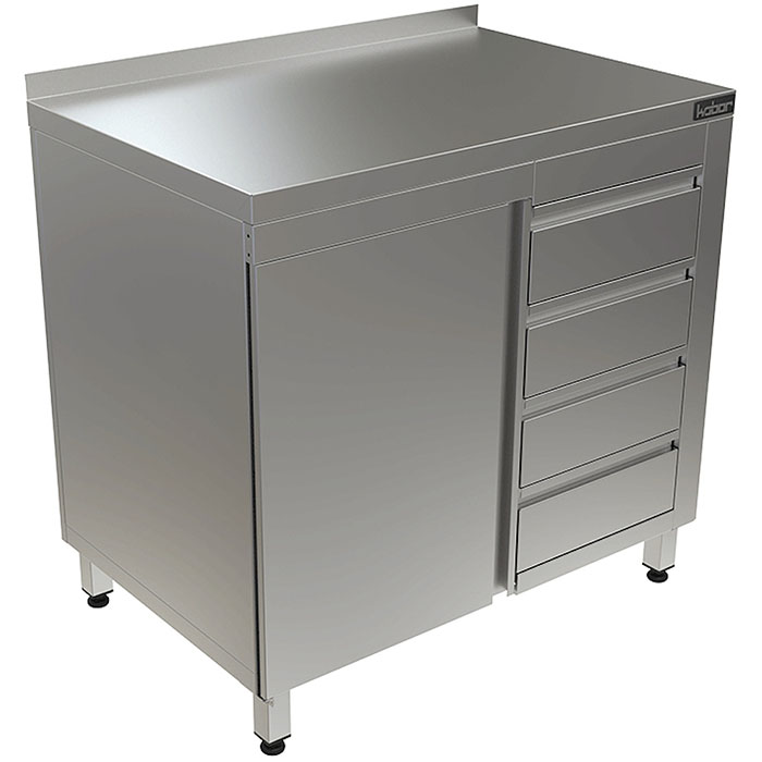 Стол-тумба кухонный Кобор СТБ/1-90/60/Р произведен из высококачественной нержавеющей стали, что позволяет использовать предмет в различных цехах. Модель оснащена бортом, полкой, отделением с распашной дверью и 4 ящиками. Во избежание прогибов столешница усилена листом ЛДСП. Ножки изделия регулируются по высоте, для исключения проблем с неровным напольным покрытием, предотвращая наклон рабочей поверхности. Разборный каркас и столешница выполнены из нержавеющей стали AISI 430.